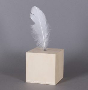 Plume blanche montée sur un cube en bois, 25 cm de hauteur pour l’ensemble. A l’instar d’une trotteuse, la plume effectue une rotation au rythme de la seconde.