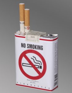 Paquet de cigarettes No Smoking, illustré du pictogramme d’interdiction de fumer. Monogramme «J K», date et la mention «Made in Eindhoven» imprimé sur le paquet. En parfaite condition. John Körmeling est un sculpteur et architecte néerlandais né à Amsterdam en 1951.