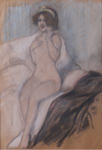 Dessin, aux crayons de couleurs, pastel, craie, 38 x 26. Monogrammé et daté 1911 à droite. Frais. En belle condition. Sous verre et passe-partout, cadre doré. Les œuvres d’Armand Rassenfosse au pastel sont rares.