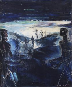 Huile sur toile, 60 x 50. Signée «P. Daxhelet» en bas à droite. En belle condition. Dans un cadre beige. Œuvre à tendance onirico-poétique, dans les tons bleus.