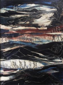 Huile sur toile, 80 x 60. Signée «P. Daxhelet» en bas à droite. En belle condition. Dans un cadre beige. Œuvre à tendance onirico-poétique dans les tons rouges et bleus.