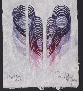 Marc LAFFINEUR. Diptère. 1973. Gravure sur bois en couleurs sur japon, 27 x 22. Signée, datée et titrée au crayon en dessous avec la mention «état».