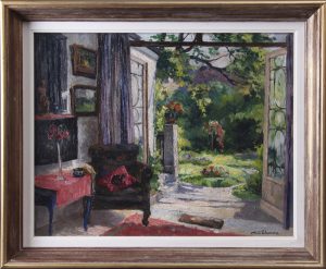 Huile sur toile, 50 x 63. Signée «M. J. Lhomme» en bas à droite. Titrée, contresignée et datée 1928 au dos. En belle condition. Dans un cadre vieil or. Sujet : Porte-fenêtre donnant sur un jardin fleuri.