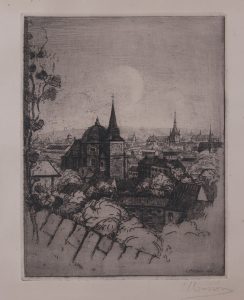 Édouard MASSON. Vue de Liège. 1940. Eau-forte, 36 x 27,5. Signée au crayon en dessous. Datée dans la plaque. Sous verre, dans un cadre de bois ciré. Traces de mouillure aux marges inf. et droite, sinon en bonne condition.