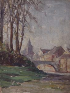 Huile sur panneau de bois, 24,5 x 19. Signée «B. Otten-Rosier» en bas à droite, avec date peu lisible (date 1922 au dos au crayon). Peintre de paysages née à Vaux-sous-Chèvremont en 1885 et morte à Grivegnée en 1973; élève d’Adrien de Witte à l’Académie de Liège (Arto).