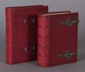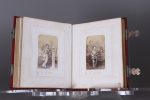 Albums à encoches aux format 17 x 14 et 16 x 12, plein chagrin carmin, à doubles fermoirs de métal argenté, décor à froid, tranches dorées (Maison Fenoux, Ch. Pezet Succr Palais Royal, Paris). Intéressants albums en très bel état, s’ouvrant sur l’Empereur Napoléon III, l’Impératrice Eugénie et le Prince impérial, la Princesse Mathilde, la Comtesse de Flandre, et continuant avec des membres de la bonne société belge et française de l’époque (baron de Villers, baron de Rasse, baron Grenier, de Waha, van den Berghe, madame Meeus, etc. Les photographies (au format d’environ 9 x 6) sont parfois signées de Ghémar à Bruxelles.
