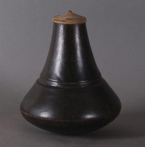 Pot à lait en bois. Hauteur : 25 cm. Avec son capuchon en fibres.