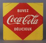 PLAQUE PUBLICITAIRE METALLIQUE. Buvez Coca Cola délicieux. 42 x 45. Quelques coups et repeints.