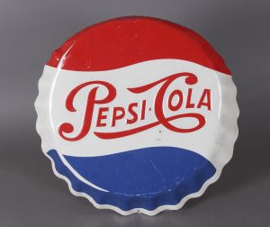 CAPSULE PEPSI-COLA. Plaque publicitaire en forme de capsule. Ens. 2 pièces.
