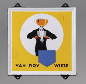Plaque émaillée, 40 x 40 cm. Dessin de van Doren : serveur stylisé présentant une bière. Restaurée.