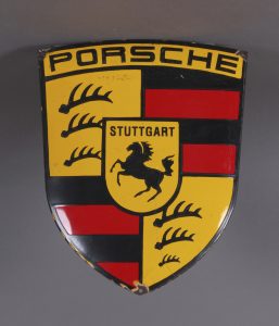 Plaque émaillée, 45 x 36. Sujet : l’écu de la marque automobile. Quelques coups et usures, sinon en bonne condition.