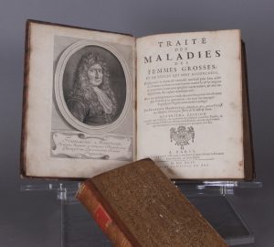 2 parties en un vol. in-4 (26 x 19,5), plein veau de l’époque, dos à 5 nerfs, dos orné, (12) p.-555 p.-(24) (table), et (6)-572 p.-(12) (table). Illustré du portrait de l’auteur gravé par Bernard Picart en frontispice et de 32 planches (table manuscrite; des pl. au début). Coiffes et coins ém., usure aux mors. L’auteur, «Maistre ès arts, ancien prevost des maitres chirurgiens jurez de la ville de Paris», fut un novateur en matière d’accouchements.