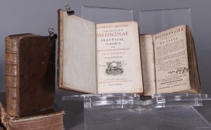 3 volumes (Docteur TISSOT, Avis au peuple sur sa santé. Quatrième édition originale. Tome premier. Paris, 1766. In-8 plein veau de l’époque; Dictionnaire botanique et pharmaceutique. 1738. Reliure plein veau abîmée; Dictionnaire portatif de santé. 1760. Tome second seul. Reliure plein veau de l’époque).