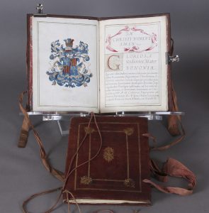 Manuscrits enluminés sur vélin. Armoiries, lettrines. Contiennent d’autres documents, à caractère religieux notamment. En bon état général.