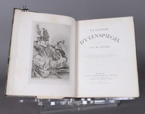 DE COSTER (Charles). La Légende d’Ulenspiegel. Ouvrage illustré de seize eaux-fortes inédites de MM. Artan, Claeys, Degroux, Dillens, Duwée, Hubert, Rops, Schaefels, Smits et Van Camp.