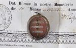 Dans une petite boîte argentée, avec sceau de cire rouge. Très fraîche. Avec certificat daté de 1919 pour la relique de saint Jean Berchmans. Joint : Vaie effigie de la Sainte Face de Jésus, exposée à Rome. Copie sur soie de l’image de Sainte Véronique. Petit cachet de cire rouge. Fraîche.