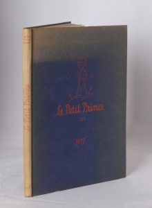 In-8 (22,5 x 16,5), en cartonnage bleu, titre au dos en long et premier plat orné en orange, dos et haut du cartonnage insolés (manque la jaquette). Illustré de dessins en couleurs, copies de ceux d’Antoine de Saint-Exupéry. L’ouvrage ayant paru aux Etats-Unis durant la guerre, l’éditeur contourna ainsi la difficulté. Notre exemplaire porte en dernière page le colophon de 5 lignes «Achevé d’imprimer sur les presses des imprimeries Paul Dupont, à Paris le 30 novembre 1941», et le numéro «689» imprimé en orange.