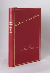 In-8 (21 x 14,5), relié en pleine peau rouge de l’éditeur. Un de 50 exemplaires numérotés sur papier pur fil Lafuma (n° 11, outre 50 H.C.) Longue dédicace manuscrite de Simenon à Hélène Wolf, sa «meilleure amie». Bel exemplaire.