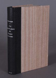 In-8 (18,5 x 12), demi-reliure noire, titre argenté au dos, les plats et le dos de la couverture conservés. Un des 100 exemplaires numérotés sur vélin des Papeteries Duverger de l’édition originale (n° 2). Bel exemplaire.