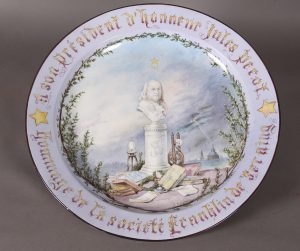[SERAING. SOCIETE FRANKLIN]. J. SCHMIDT. Grand plat en céramique, Hommage de la Société Franklin à son président d’honneur Jules Perot.