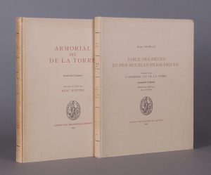DENILLE (Roger). Tables des pièces et des meubles héraldiques contenus dans l’armorial dit de la Torre. Liège, Société des bibliophiles liégeois, 1982. In-4 (32 x 24), en cartonnage d’éditeur. Un des 125 exemplaires nominatifs sur Hollande. Bel exemplaire.