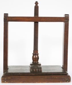 Presse à livres, modèle de table, 19e siècle, avec récupération d'éléments sculptés plus anciens.