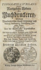 LESSER, Friedrich Christian.- Typographia Jubilans, das ist, Kurtzgefasste Historie der Buchdruckerey [...]; bey dem dritten Jubel-Fest derselben welches dieses Jahr auf Johannis [...].