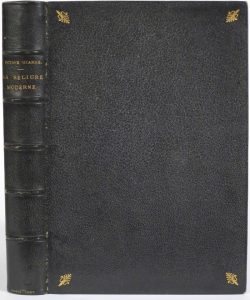 Paris, Édouard Rouveyre, 1887. In-8°; 72 h.-t. (lég. mouill. dans le haut des pp., ex. lég. bruni). Rel. de l'époque : plein chagrin noir, fleurons d'angles dorés sur les plats, dos à nerfs, tête dorée, couv. cons. (ombres blanches sur les plats; mors, nerfs, coiffes et coins frottés, dos lég. passé). ÉDITION ORIGINALE tirée à 1.600 ex. num., un des 1.500 sur papier vélin (n° 772). Couverture ornementée par Adolphe Giraldon, frontispice de Lynch gravé à l'eau-forte, 72 hors-texte héliogravés protégés par des serpentes légendées figurant diverses reliures, et nombreux in texto en noir. Texte intéressant sur les écrivains de la reliure, les bibliophiles du temps et les divers types de reliure. L'ensemble est exclusivement consacré à la reliure française.
