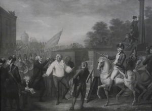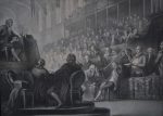 4 eaux-forte pointillées, 44 x 59,5 cm (visibles). Sous vitres-passe-partout noir et doré, cadres de bois moulurés dorés (non désencadrées). RARISSIME ET BELLE SUITE figurant : La famille royale quittant le palais des Tuileries pris par les révolutionnaires, le 10 août 1792.-- Louis XVI jugé par la Convention nationale, décembre 1792.-- Adieux à sa famille, le 20 janvier 1793.-- Louis XIV et l'abbé Edgeworth de Firmont au pied de l'échafaud, le 21 janvier 1793.