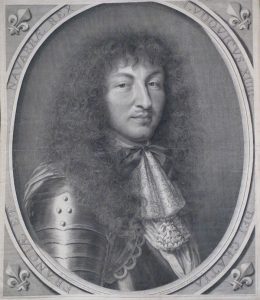 1666. Eau-forte, cuv. 51,8 x 44,5 cm + marges, papier vergé (lég. marque d'un pli central horizontal renforcé au verso). Louis XIV en buste, représenté à l'âge de 28 ans, de trois quart avec le visage de face. Il porte la perruque, un imposant col de tissu, et l'armure.