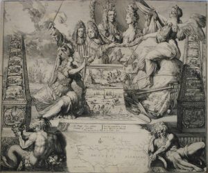 Eau-forte, TC 46 x 57 cm, papier vergé non filigrané (rognée sur TC en haut sinon petites marges, traces de montage en haut au verso). Importante planche d'histoire richement élaborée figurant outre les scènes de bataille à La Hougue et Fécamp, une carte de la côte bretonne, 2 pyramides avec les noms des bâtiments français coulés, le portrait double de Guillaume III et Marie d'Angleterre et plusieurs personnages allégoriques.