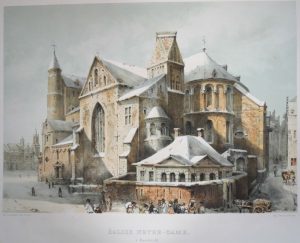 Maastricht, 1855. Gr. in-f° : titre lithographié-4 pp. ; 8 pl. (qqs toutes faibles rouss.). Rel. de l'époque : toile vert-olive, plat orné d'un encadrement de filets dorés, nom d'auteur et titre frappés or sur plat sup. (lacune de 2 x 1 cm dans la marge en haut à g., qqs faibles rouss. sur les gardes). ÉDITION ORIGINALE et unique de cet important recueil. Comportant de splendides vues chromolithographiques des églises de Saint-Servais et Notre-Dame à Masstricht, Notre-Dame à Roermond, Saint-Martin et Notre-Dame à Tongres.