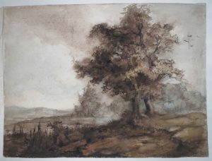 19e siècle. (1). Deux arbres se détachant sur un ciel. Plume, pinceau, lavis à l'encre bistre et aquarelle de tons bleutés, 25 x 33,5 cm, papier vélin, monogrammé en bas à dr., fixé par les coins sur f. de support (qqs rouss. concentrées en haut à g.).--