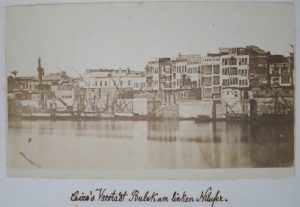 [C. 1880 ?]. Photos en tirage albumine, +/- 8 x 6 cm, collées en plein sur carton blanc et cernées d'un double filet doré imprimé, toutes légendées en ALLEMAND (qqs pet. piqûres, qqs pet. déchirures). Vues de mosquées (de Hassan, Mahmud, Emir Akhur, Ahmed Tulun...), tombeaux (mère du sultan Hassan, de Barkuk, des mamelouks, des califes), portes (bab en nasr, "bab el vessire"), divers quartiers certains en ruine et d'un dénuement total, d'autres mieux entretenus (Bulak, quartier copte, Esbekieh, citadelle, mosquée Mehmad Ali)... Trois photos signées Wilhelm HAMMERSCHMIDT et une Antonio BEATO, tous deux installés au Caire dans les années 1870-1880.