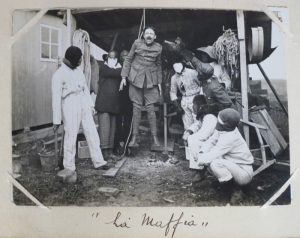 1914-1916. 158 photos en noir (de 3 x 5,5 cm à 8 x 11 cm), toutes légendées en français, non collées et retenues par les coins. Dans un album ad hoc in-16° oblong en toile écrue (rouss.) Photos du roi Albert Ier et/ou du prince Léopold avec diverses personnalités (général Jacques, ministre Van der Velde), soldats (mitrailleurs, lanciers, motocyclistes, "Fataki réglant un tir d'armes à Rousdam", escadrilles, aviateurs...), photos d'armes lourdes, vie des soldats (soupe, barbier, bain dans le canal de Furnes à Loo, "cuisines roulantes françaises près de Niewpoort"), vues de ruines (Oostkerke, Rousdam, Dixmude, Ypres, Caeskerke, La Panne, Coxyde, Lampernisse...), hôpital, tranchées... Nombreuses photos relatives à l'aviation (école d'aviateurs à Étampes ou Bournemouth, avions, aérodromes, aviateurs dont plusieurs ont signé les photos, accident mortel d'avion).