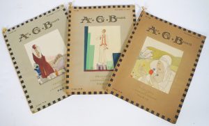 Paris, n° 104-109, 114, 118-122, avril 1929 [- octobre 1930]. 12 fasc. pet. in-f° (qqs rouss., bords des pp. souvent us.). Brochés, cordonnets de coton jaune, sous couv. illustrées (qqs taches, plusieurs bords de couv. brunis, lég. us.). Chaque fascicule, précédé et suivi de publicités, comprend des textes illustrés de photographies et dessins en noir ou couleurs à l'aquarelle, par René Drivon en majorité. Créations de Jean Patou, Molyneux, Worth, Jeanne Lanvin, Paul Poiret, Redfern, Philippe & Gaston, Premet, Louise Boulenge, Chanel (à partir de septembre 1930)... Traite de mobilier, architecture d'intérieur, lainage, dentelle, coiffure, chapeaux... Avec, dans chaque fascicule, une double page reproduisant un motif de tissu.