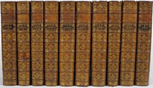 Paris, chez les Libraires associés [Le Mercier, Desaint & Saillant, Jean-Thomas Hérissant, Boudet, Vincent, Le Prieur], 1759. 10 vol. in-f°; front. et portrait (piqûres et rouss., qqs pp. lég. brunies, qqs pet. défauts, rares taches et déch. marg.). Rel. de l'époque : plein veau marbré, plats cernés d'un filet à froid, dos fleuronnés dorés à nerfs, tr. rouges (qqs mors en partie fendus, pet. défauts ou us., qqs pet. manques, qqs coins à nu, ex-libris armorié moderne et qqs étiq. de classement sur les contreplats). Dernière édition (éd. orig. : 1674) de cet important dictionnaire enrichi des suppléments de l'abbé Goujet et avec les corrections de M. Drouet.