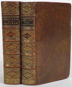La Haye, Arnout Leers, 1682. 2 vol. in-12° : [48]-600-[14], [60]-401-[1 bl.]-[5] pp.; 3 h.-t. et 2 tableaux dépl. (pet. rouss., rares taches ou déch. marg., mouill. marg., pp. lég. jaunies à la fin du vol. I). Rel. de l'époque : plein veau moucheté, dos fleuronnés dorés à nerfs, tr. jaspées (restes d'une étiq. sur le plat inf. du vol. II, rares lég. us., 3 coins fort émoussés, ex-libris armoriés modernes sur les contreplats). Illustré de 3 portraits et avec 2 tableaux dépliants (dont 1 de la Maison de Commines).