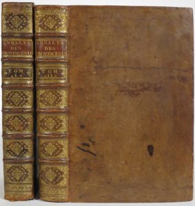 La Haye, Charles Le Vier, 1719 [- 1726]. 2 vol. in-f° : [10]-viii-150-842, [8]-xvii-[1]-958-[44] pp. (incomplet du dernier f. blanc et d'un f. lim. au vol. I (?), certains ex. contiennent 8, 10 ou 12 pp. lim. au vol. I, qqs pp. lég. brunies, pet. rouss., piqûres, pet. mouill. marg. au vol. I). Rel. de l'époque : plein veau moucheté, dos fleuronnés dorés à nerfs, tr. jaspées de rouge (manque à la coiffe inf. du vol. I, pet. us., taches ou mouill., restauration au plat inf. du vol. II, longues griffes ou éraflures sur le plat sup. du vol. II, qqs coins fort émoussés, ex-libris armoriés modernes sur les contreplats). ÉDITION ORIGINALE de cette chronique des années 1646 à 1678 illustrée de quelques in texto, bandeaux historiés ou ornementés et de vignettes de titre identiques gravés sur cuivre. Pasteur à Rouen au moment de la Révocation, Basnage (1653-1723) fut obligé de fuir la France et se réfugia en Hollande où il devint théologien, controversiste, historien et diplomate au service du Grand Pensionnaire Heinsius.