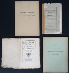 In-8°, brochées. Relation de la Bataille de Loefel du 2 Juillet 1747. Avec le Plan. Lille, se vend chez Pancoucke, (de l'Imprimerie de la Vve Danel & Fils, 1747). 8 pp. et 1 cuivre à déplier rehaussée à l'aquarelle.-- POLAIN, A.- De la souveraineté indivisé [sic] des évêques de Liège et des États-généraux sur Maestricht. Liège, Collardin, 1831.-- SCHAEPKENS, J.- Les sièges de Maestricht en 1407 et 1408, pendant le règne de Jean de Bavière. Tiré à part, (1903).-- IDEM.- Essai de notice biographique sur Arnaud Schaepkens. Idem.