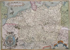 Gravure sur cuivre, TC 36 x 50 cm, rehaussée à l'aquarelle (pli central, pet. lacunes). Sous passe-partout, vitre et cadre. Carte délimitée au nord par les côtes du continent européen de Dieppe à Königsberg (Kaliningrad) et s'étendant dans le sud jusqu'au large de Venise. PREMIER ÉTAT faisant partie d'une édition parue avant 1580 ou 1581 ("Bergcastel" sur la Moselle).