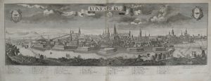 [ Augsburg, G.B. Probst, 18e s.]. 2 gravures sur cuivre collées ensemble au milieu, 42,5 x 109 cm (pli central, pet. lacunes et qqs chiffres à l'encre dans les marges, coins fortifiés au verso). Grande vue de Kaliningrad, située dans l'enclave territoriale de la Russie baltique. Représentation du 18e siècle quand la ville connut son apogée commerciale et intellectuelle. Gravée par Georg Balthasar Probst (1643-1748).