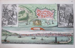3 gravures sur cuivre, formats divers, 1 rehaussée en couleurs (plis verticaux, lacune dans le texte). (1). Planche avec plan et vue de Barcelone occupée par les Français et Espagnols mais libérée par les Alliés le 12 mai 1706. Agrémentée de 2 scènes allégoriques. Extraite d'une estampe journal ("nieuwsprent") gravée par Pieter Sluyter et publiée par Andries van Damme; # Rijksmuseum Amsterdam RP-B-OB.83.228.-- (2). "Le Profil de la ville et cité de Barcelone, capitale de la province de Catalogne". Amst., François L'Honoré. Extraite de l'édition française de l'ouvrage "Les délices par l'Espagne et le Portugal [...]" (1707-1741).-- (3). "Madrit". A[ugusta] V[indelicorum], 1720. Par Gabriel Bodenehr.