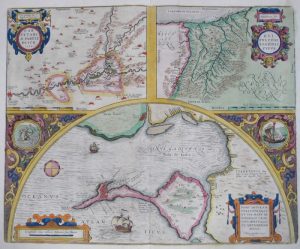 3 gravures sur cuivre, formats divers, 2 rehaussées à l'aquarelle (pli central, mouill., part. us., déch. dans les marges). (1). Carpetaniae partis descr[iptio] 1584. Guipuscoae regionis typus. [Carte de Cadiz] Hanc insulam perlustrabat [...]. [Anvers, 1609-12]. Planche avec 3 cartes dans une composition particulière : en bas la baie de Cadix en carte semi-circulaire par Joris Hoefnagel, au-dessus la province basque du Guipuscoa et l'ancien Carpetania avec Madrid et Castille-La Manche. Extraite de l'édition latine du "Theatrum orbis terrarum" d'Abraham Ortelius publiée par Jan Baptist Vrients ou Jan et Balthasar Moretus; # van der Krogt [6058], [6020], [6115:31].-- (2). Planche avec 3 vues superposées de Séville, Cadix et de Malaga par Joris Hoefnagel. Deuxième état extrait du "Civitates orbis terrarum" par Georg Braun et Frans Hogenberg non mentionné par van der Krogt; # van der Krogt IV[3973].-- (3). HOEFNAGEL, Joris.- Loxa. Vue à vol d'oiseau de la ville andalouse près de Grenade. Extraite du 2e volume du "Civitates orbis terrarum" par Georg Braun et Frans Hogenberg publié en 1575; # van der Krogt IV[2430].