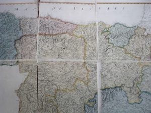 26 gravures sur cuivre, c. 44 x 55,5 cm, rehaussées à l'aquarelle (bords us.). GRANDE ET RARE CARTE DE L'ESPAGNE composée de 23 cartes avec les montagnes, le réseau routier militaire, les batailles, etc., utile pour les opérations militaires dans la péninsule. Assemblage de cartes de Tomás López (1730-1802), William Faden (1749-1836), Vicente Tofiño de San Miguel (1732-1795), et de cartes extraites du "Petit Neptune français" par Giovanni Rizzi Zannoni (1736-1814).