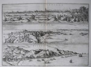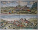 2 gravures sur cuivre, TC 34 x 47 cm, 32,5 x 41,5 cm + marges, 1 rehaussée à l'aquarelle (pli central, taches). (1). Planche avec 3 vues superposées de Séville, Cadix et Malaga par Joris Hoefnagel. Troisième état extrait de l'atlas des villes espagnoles publié par Johannes Janssonius en 1657 sous le titre "Theatrum in quo visuntur illustriores Hispaniae urbes [...]"; # van der Krogt IV[3973] et [42:16].-- (2). Planche avec 2 vues superposées de Lebrija et Setenil. Premier état extrait de l'édition française du "Civitates orbis terrarum" par Georg Braun et Frans Hogenberg publiée de 1583 à 1645; # van der Krogt IV[2237] et [3958].