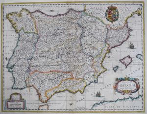 2 gravures de cuivre, TC 41 x 53 cm et 37,5 x 49 cm + marges, rehaussées en couleurs (pli central, taches). (1). Regnorum Hispaniae nova descriptio. Amst., G. Blaeu, s.d. Extraite du "Théâtre du monde" publié en 1635 ou 1638 par Guillaume et Joannes Blaeu; # van der Krogt II[6000:2B] et [2:111/2].-- (2). SANSON, Nicolas.- L'Espagne subdivisée en tous ses royaumes, princip[au]tés, seign[eu]ries [...]. Paris, P. Mariette, 1663.