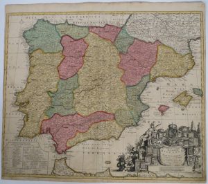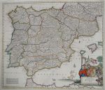 2 gravures sur cuivre, TC 48 x 57,5 cm et 49,5 x 57 cm, rehaussées en couleurs (pli central, marges rognées et brunies, déch.). (1). SCHENK, Petrus.- Novissima et accuratissima regnorum Hispaniae et Portugalliae tabula [...]. Amst., s.n., 1706.-- (2). DANCKERTS, Justinus.- Accuratissima totius regni Hispaniae tabula. Amst., J. Danckerts, s.d.; # Koeman II [Dan1/7].
