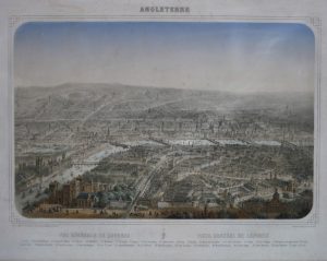 Paris, L. Turgis, [c. 1865]. Lithographie en couleurs, 39 x 49,5 cm + marges (taches, déchir. dans la marge, pli vertical). Sous passe-partout et cadre de bois (non désencadrée). Panorama de Londres avec la Tamise et ses ponts, la voie ferrée vers la gare de Waterloo, le pont de Hungerford, le palais de Lambeth, la cathédrale Saint-Paul, le palais Buckingham, l'abbaye Westminster, etc. Les bâtiments principaux sont numérotés et identifiés dans la légende en bas.