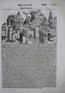 (1). SCHEDEL, Hartmann.- Qui[n]ta etas mu[n]di. Foliu[m] LXXII. Mediolanum. Feuille volante du "Liber chronicarum" ou "Chronique de Nuremberg" de 1493, avec texte latin et figures sur bois; au recto vue de Milan, au verso illustrations des rois et intellectuels du cinquième âge du monde avec Darius, Sophocle, Hérodote, etc.-- (2). Milan. Ville forte, capitale du duché du même nom, l'une des plus grandes et des plus considérables de l'Italie. Paris, Daumont. Gravure sur cuivre, cuv. 35 x 52 cm + marges, rehaussée à l'aquarelle.